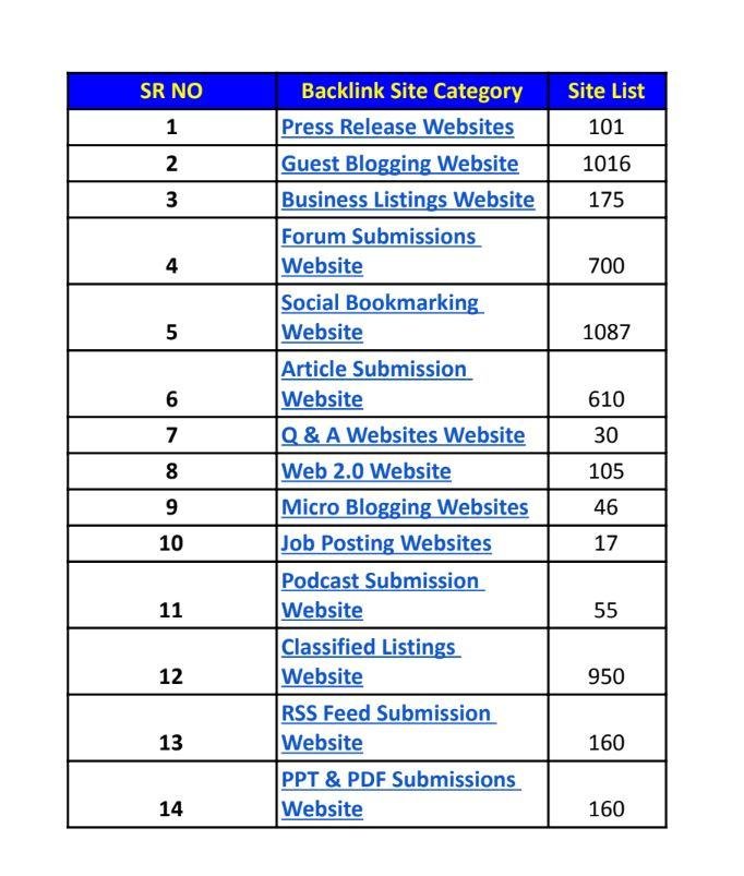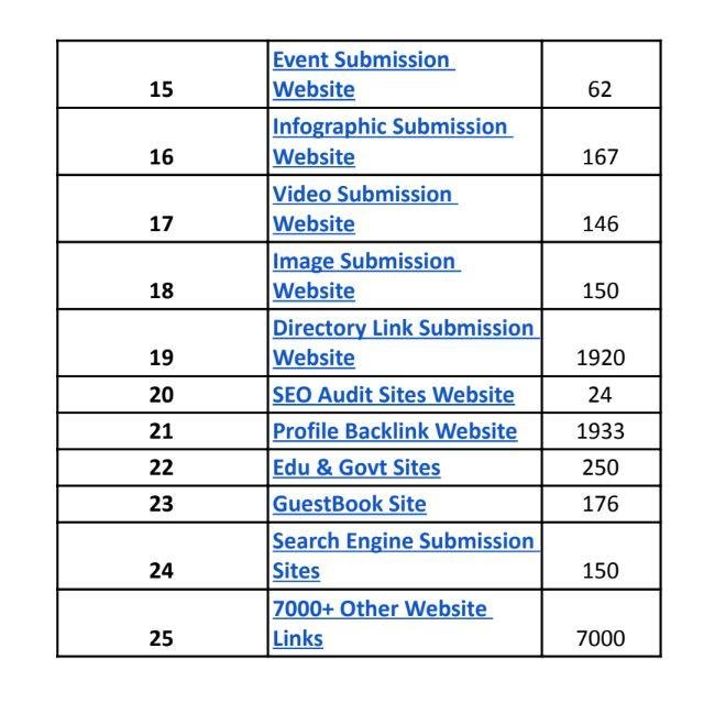 - Backlinks from various categories and niches, such as press release, guest blogging, business listings, forum submissions, social bookmarking, article submission, Q&A, web 2.0, micro blogging, job posting, podcast submission, classified listings, RSS feed submission, PPT & PDF submissions, event submission, infographic submission, video submission, image submission, directory link submission, SEO audit sites, profile backlinks, edu & govt sites, guestbook sites, and search engine submission sites